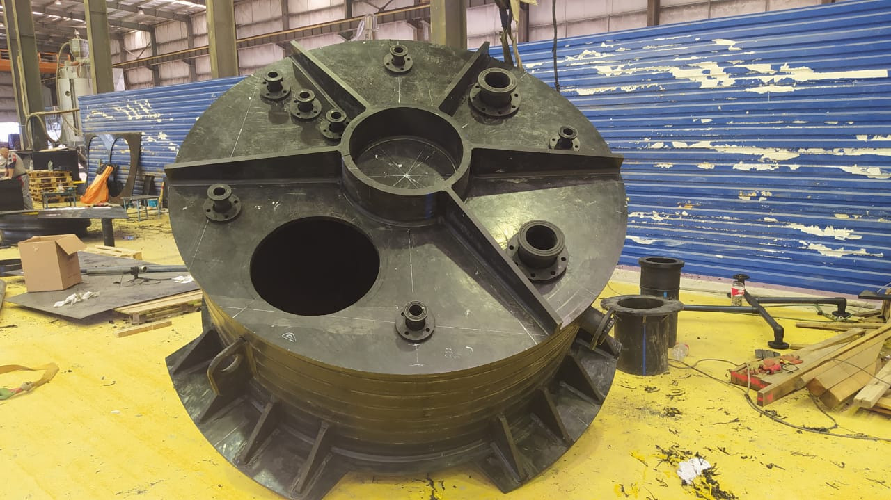 Скруберы являются полным аналогом оборудования из нержавеющей стали, пришедшего в негодность из-за коррозии. Толщина внутренней стенки 50мм, толщина всего корпуса составила 150мм. Особенность усиления позволяет оборудованию быть устойчивым не только к агрессивным средам, но и к термической нагрузке, а также к внешним механическим воздействиям. По заявке заказчика было реализовано размещение диффузоров из нержавеющей стали во внутренней части Скрубера. Изготовление Пенных Скруберов - один из уникальных проектов РИКАЗ.