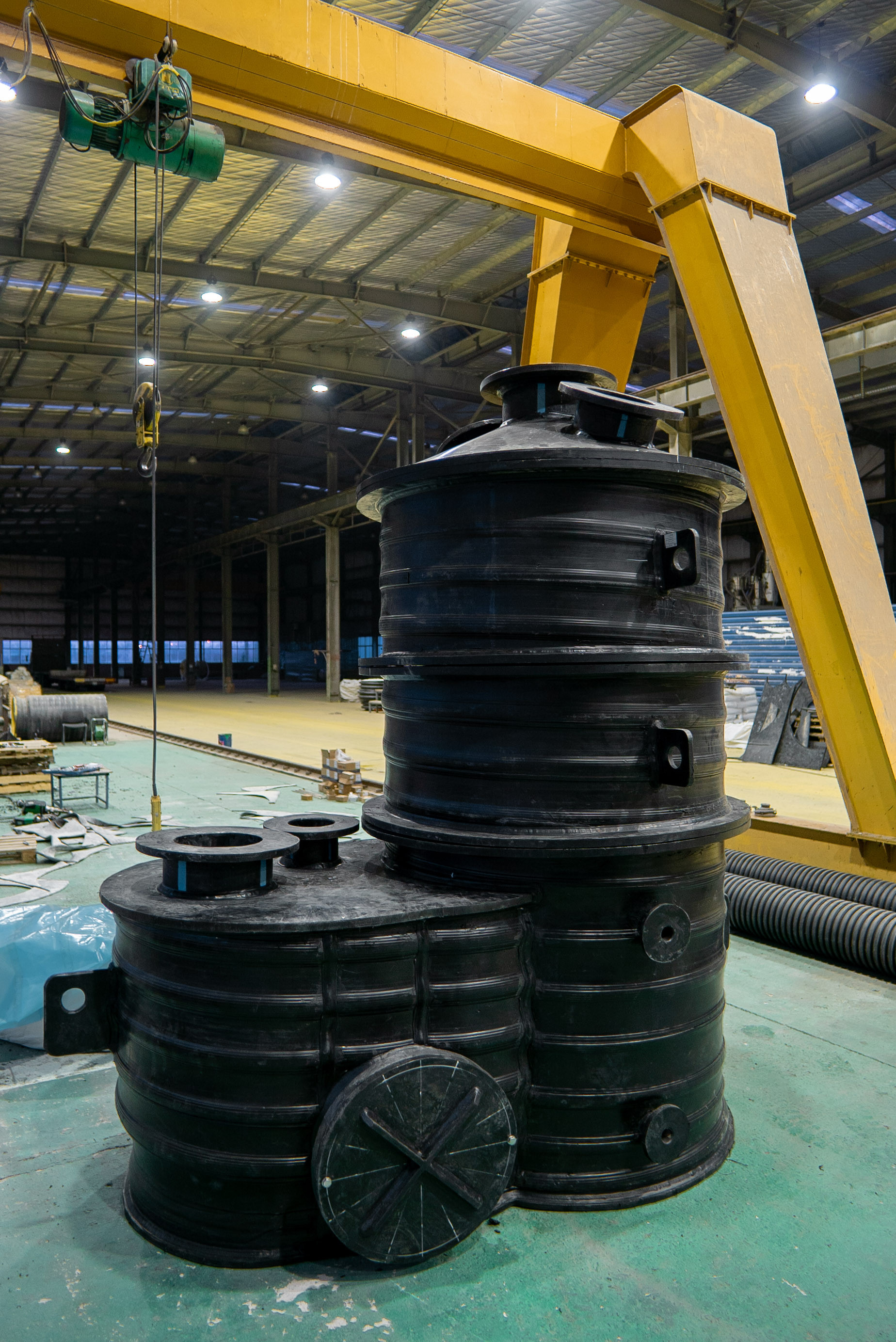 Скруберы являются полным аналогом оборудования из нержавеющей стали, пришедшего в негодность из-за коррозии. Толщина внутренней стенки 50мм, толщина всего корпуса составила 150мм. Особенность усиления позволяет оборудованию быть устойчивым не только к агрессивным средам, но и к термической нагрузке, а также к внешним механическим воздействиям. По заявке заказчика было реализовано размещение диффузоров из нержавеющей стали во внутренней части Скрубера. Изготовление Пенных Скруберов - один из уникальных проектов РИКАЗ.
